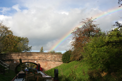 Wednesday morning was quite cold - just a little ice inside one or two of the north-facing portholes - but glorious. I am able to resurrect the wood burner quite quickly these cold mornings so we are soon comfortable. The frost disappeared quickly and the journey onwards towards Marple was very lovely as the trees are wonderfully colourful. Clouds pile in and a wonderful rainbow arches across the sky in front of us. We are in Marple surprisingly quickly, before one o'clock, stopping only twice, once under a bridge while Nick dashed back to cut a dead branch he noticed and once to check if the baker in High Lane was baking which sadly he wasn't.