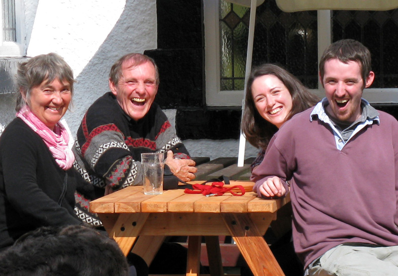 The weather is horrid as we travel towards Macclesfield and remains so all of Friday until the not so early hours of Saturday. In spite of this George and then Simon arrive and we walk back to the boat, have lunch and head back to Bollington where the weather is particularly bad as Nick turns and moors the boat. He and a heavyweight chap need to use the iron railings of the mill to haul the boat in as the wind appears to gust badly just there. I acquaint myself (with lots of help from the others) with my new camera, a Canon Powershot which is compact enough for my pocket but a comfortably fits my hand. We light the fire, share an evening meal and experience the pleasures of Chinese chequers which is new to the younger generation. It is lovely to have family here with us but terrible that the weather is so ghastly for them. We wake to an improved day and by the time we set off after shopping it is really quite pleasant, and George, Simon and Nick enjoy each others company on the stern. We pass through Macclesfield and stop at the Olde Kings Head, an 400 year old pub by Gurnett Aqueduct, and we actually sit and enjoy the sun. Simon is able to set my camera for a successful picture of us all - we are laughing because a car crossing the path of the shot actually sees what is going on and stops for the picture! |