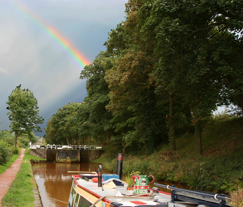 Our visitors arrived at 9.30 just as we prepared to go through the Big Lock, then it was plain sailing all the way to Northwich. After an hour and a half we stopped in a beautiful area where the canal was particularly wide, I guess because of subsidence. Across the cut was a bank of reeds and to the south a field with Canada Geese in the foreground and cows and calves in the distance. Within minutes a swan was tapping on my kitchen window and Elanor fed it, along with ducks and Canada geese. We also enjoyed watching grebe diving, checking out how long they were under and guessing where they would appear. We had a sandwich lunch after which Elanor changed into her school uniform. Nick chatted to Ruth and David on Winddrift. It appears they are staying put over the weekend and would keep an eye on the boat if we left it alongside them. This was excellent as all we had to do was deliver our lovely visitors to Orchard Marina, which turned out to be just close to Elanor's ex-nursery. Nick set off on the bike to locate the car hire place and when he returned we stayed there awhile, sharing a cuppa with some canal walkers. We then returned to the magically peaceful place. It was hard to imagine the heavy industry of Northwich just a mile or so way. To enhance the beauty of the place there was a rainbow. Ruth and David came and shared a bottle of wine with us and it turns out that they, like us, are considering winter on the Llangollen. When they left we observed a beautiful sunset with spine-tingling skeins of Canada geese encircling our lagoon. |