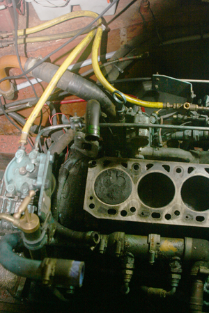 On Thursday morning, Tony and Phil appear around ten: apparently they have spent an hour or two with a diesel injection specialist and it has paid off. An hour or so later the engine starts with ne'er a wisp of white smoke, and by midday we are parting company for the last time. One small problem remains, the tachometer isn't registering, but that's something I can sort myself, and it won't stop us travelling. Apparently, there is a cold start advance device which increases fuel supply to start the engine, and this is not working and has been incorrectly set up ever since we bought the boat: so to overcome the problem the fuel timing has been mechanically retarded, and I have made a record of that for future reference. It all sounds feasible and present evidence seems to support it; IT RUNS! Before reassembling the engine enclosure, I change the oil and oil filter, and pump out all the water/diesel lying in the engine bund. Tomorrow we'll clear the cratch and look at the electrics. Tonight I'll sleep well.